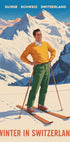 Rejs til Schweiz’ højeste tinder med Swiss Alpine Bliss af Andreas Magnusson. En retro-inspireret rejseplakat, der fanger de solkyssede alpetoppe, skarpe skygger i den rene sne og dynamikken fra skiløb på brede pister. Et tidløst blik på vinterens klare ro og eventyr. Farverne er klare og nostalgiske, med høj himmel og strålende snetoppe.