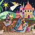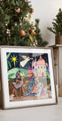 Tre vise mænd rider gennem en stjerneklar nat mod Betlehem, guidet af julestjernen. Farverige huse med kupler og tage danner en orientalsk by, mens palmer og dyr følger dem på vejen. Caroline Bonne Müller forener eventyrlig folkekunst, varme farver og julestemning i et poetisk motiv. Perfekt til julens hyggelige stemning.
