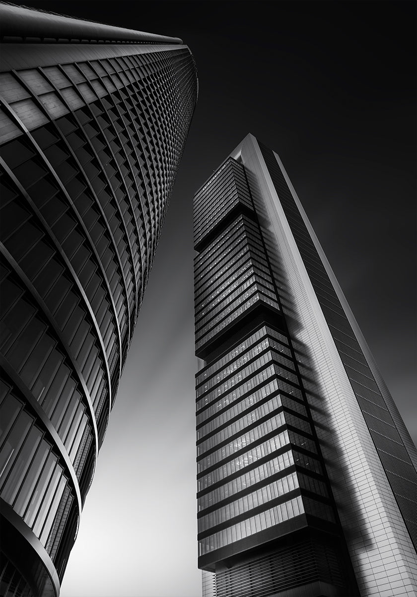 Together af Jorge Ruiz Dueso indfanger en natlig scene fra Madrid, hvor månen svæver over byens skyline. Set i dramatisk perspektiv strækker to moderne bygninger sig mod himlen, deres rene linjer og geometriske rytme skaber ro og spænding på én gang. Perfekt til elskere af arkitektur og spansk nattestemning.