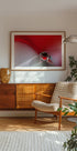 Un'accattivante opera d'arte macroastratta con una delicata goccia d'acqua su morbidi toni rossi e neutri. Il primo piano crea un senso di intimità ed eleganza, rendendolo un pezzo perfetto per gli interni moderni.