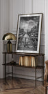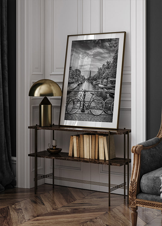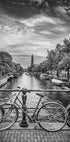 En stemningsfuld, monokrom skildring af Amsterdam af Melanie Viola: langs Oude Schans spejler kanalen himlen, mens cykler står parkeret ved rækværket og husbåde driver forbi. I baggrunden rejser Montelbaanstoren sig ikonisk over de historiske facader under en skyet himmel – rolig storbypoesi. Et tidløst blik på byens sjæl.