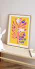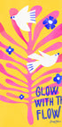 Un poster allegro e motivazionale con due colombe bianche che volano tra foglie rosa intenso e fiori blu su uno sfondo giallo vivace. La tipografia giocosa "Glow with the Flow" aggiunge un messaggio edificante di positività e gioia. Perfetto per portare buone vibrazioni in ogni stanza.