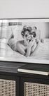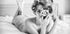 Un elegante poster in bianco e nero che cattura un ritratto di ispirazione retrò di una donna con boccoli vintage, sdraiata elegantemente su un letto mentre tiene in mano una macchina fotografica classica. Con un mix di sensualità, nostalgia ed espressione artistica, la fotografia celebra l'attrazione femminile e il glamour senza tempo.