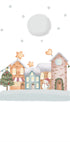 Vintage Winter er en charmerende vinterillustration af Xuan Thai: et sneklædt byrum med hyggelige bygninger, et klokketårn og en glad snemand under glitrende stjerner. Varme vinduer og små hjerter og dekorationer giver julemagien et kawaii-præg i bløde farver og et let vintage- og pixelinspireret udtryk.