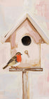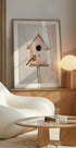Una tranquilla atmosfera invernale in colori pastello: un'accogliente casetta per gli uccelli si trova nella neve, mentre un curioso pettirosso riposa sul bordo. Le pennellate morbide, simili a quelle acriliche, e le forme semplici donano un'espressione poetica e nordica. Fiocchi di neve discreti e colori tenui creano pace e intimità. Illustrazione di Ohkimiko. Perfetto per un'atmosfera invernale in casa.