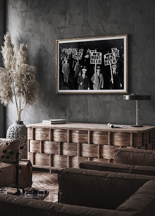 Una straordinaria fotografia d'epoca in bianco e nero che immortala una protesta storica durante il proibizionismo. I manifestanti reggono cartelli con la scritta "We Want Beer", un potente simbolo della richiesta di alcolici da parte del pubblico all'inizio del XX secolo. Perfetta per gli appassionati di storia, la fotografia d'epoca e un arredamento da bar unico.
