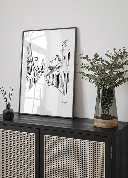 Vågn op i Portugal med en elegant rejseskitse af Awol Art Alex: en soloplyst portugisisk gade med caféborde, smalle facader og et diskret kirketårn i horisonten. Fine, minimalistiske linjer, lamper, vinduer og døre skaber dybde og perspektiv – en rolig morgenstemning fra Lisboa til Porto. Perfekt til elskere af portugisiske gader og rejsedrømme.