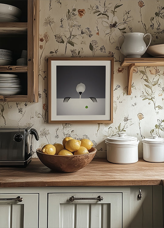 Un poster di natura morta giocoso ed elegante di Wieteke de Kogel: forchette e cucchiai lucenti diventano piccole mani avide che raggiungono un singolo pisello sul tavolo. La composizione pulita, la lucentezza metallica opaca e il punto scoppiettante del verde creano umorismo, eccitazione e fascino modernista, perfetti per la cucina, la sala da pranzo e le conversazioni.